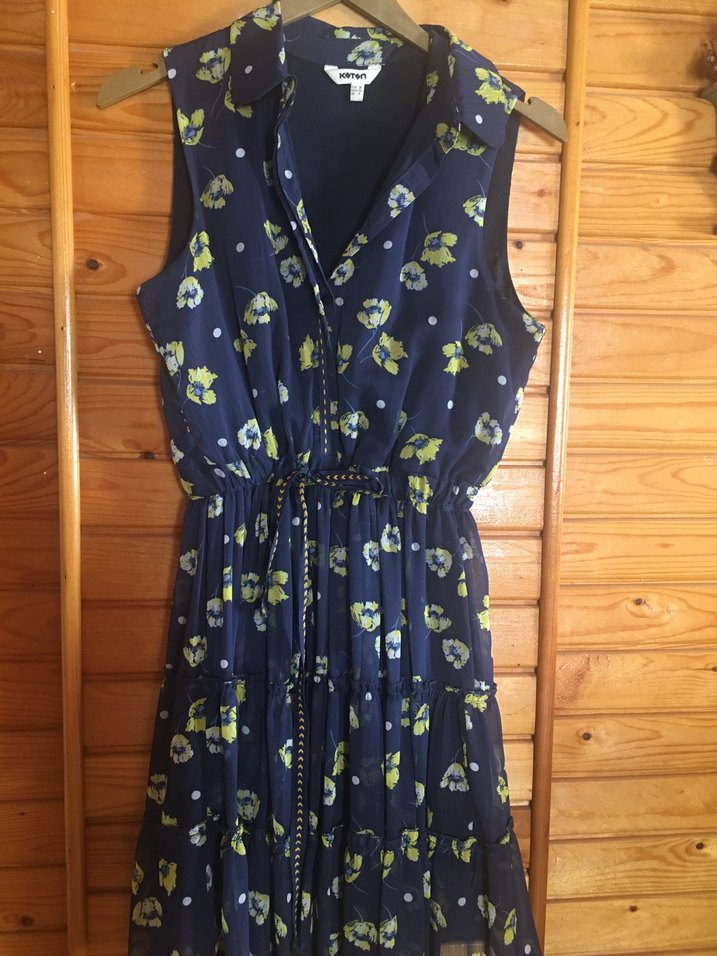 Kemerli, yakalı, kolsuz mavi midi elbise, çiçek desenli ve bol kesim. Yumuşak sentetik kumaştan, günlük kullanım için bohem tarzda.