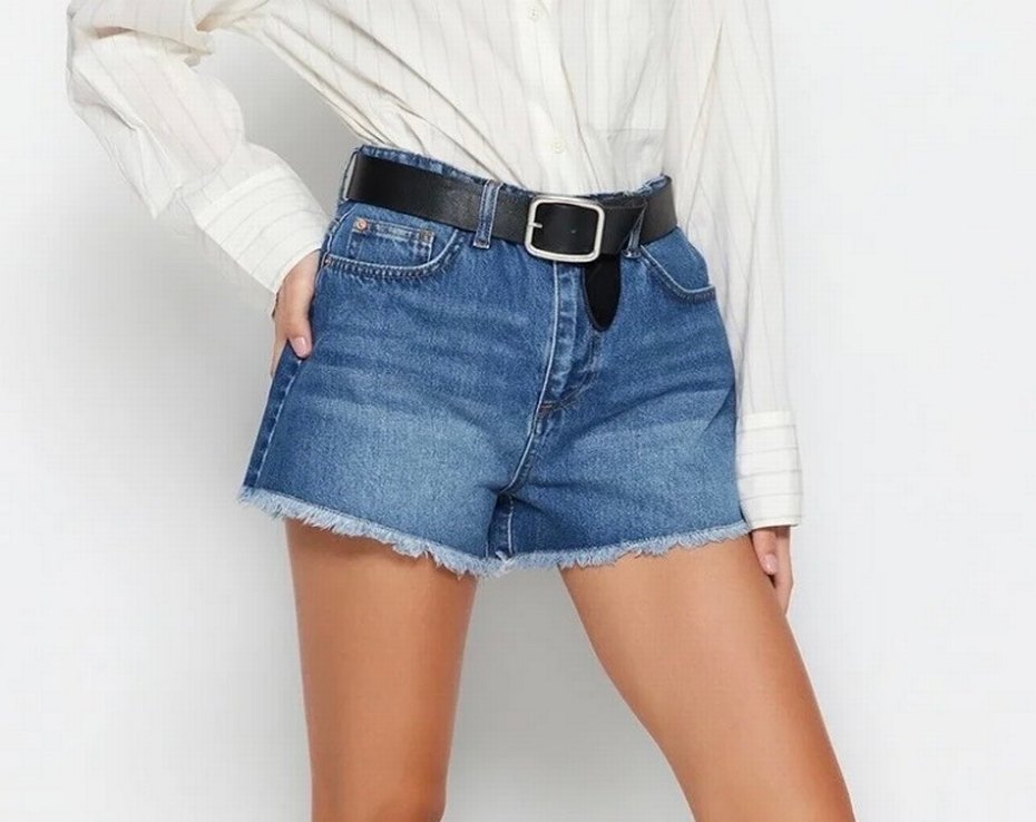 Kemerli bel ve rahat kesimli mavi denim mini şort, günlük ve sokak stiline uygun. Kenarları kesik ve desensizdir.