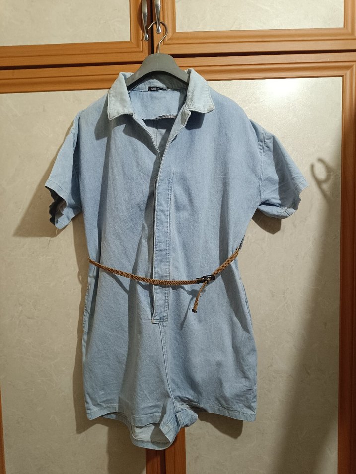 Kemerli, kısa kollu, yakalı mavi denim tulum. Rahat kesimi ve midi boyuyla günlük sokak stiline uygun, desensiz tasarım. ölçüleri ekledim lütfen inceleyiniz iki koltuk arası 60 cm omuzdan boy 90 cm dir