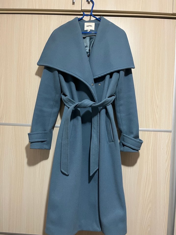 Geniş yakalı ve kemerli mavi kadın kaban, uzun kollu ve cepli, şık ve sıcak tutan bir dış giyim ürünüdür.