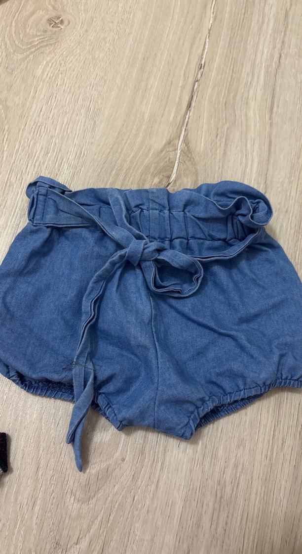 Kemerli bel ve bol kesimle tasarlanmış, pastel mavi renkte kız kot şort. 6 aydan 12 aya kadar olur