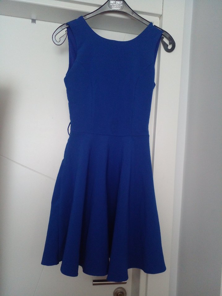 Kemerli, kolsuz, bisiklet yaka, parlak mavi midi sırt dekolteli elbise. Modern klasik tarzda, günlük kullanım için uygundur.Kemeri yok,astarli