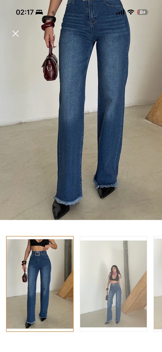 Mavi kot pantolon, normal kesim ve uzunlukta, kemerli bel detayına sahip. Parlak yüzey ve püsküllü paça detayı ile günlük kullanıma uygun.