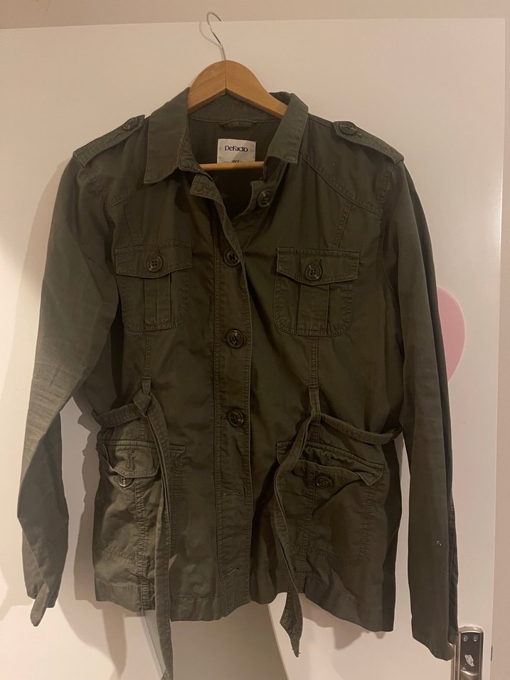 Kemerli trençkot koyu yeşil renkte uzun kollu ceket. Notlu yaka ve yumuşak dokulu kumaştan, günlük sokak stiline uygun.