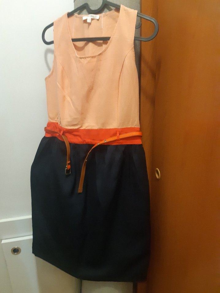 Kemer detaylı, kolsuz ve halter yaka kesime sahip, bej ve koyu renklerin birleştiği, midi uzunlukta, ofis için uygun kadın elbisesi.