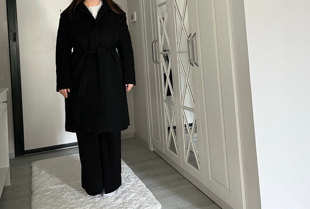 Kadın kaban, kemerli ve kesik yaka detaylıdır. , normal boyda ve regular fit olarak tasarlanmıştır. Minimalist ve normcore tarzda, günlük kullanıma uygundur.