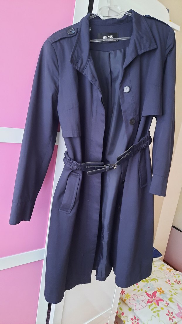 Kemerli bel ve kesik yaka detayıyla, koyu lacivert renkte, midi boy kadın trençkot. Günlük ve iş stili için uygun, rahat kesim.