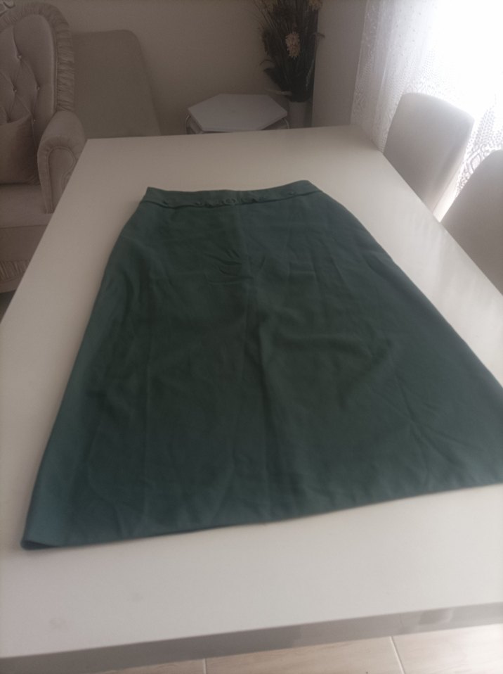 Kemerli bel ve normal kesime sahip koyu yeşil midi etek. Düz ve minimalist tarzda, günlük kullanıma uygun sentetik kumaştan üretilmiştir.