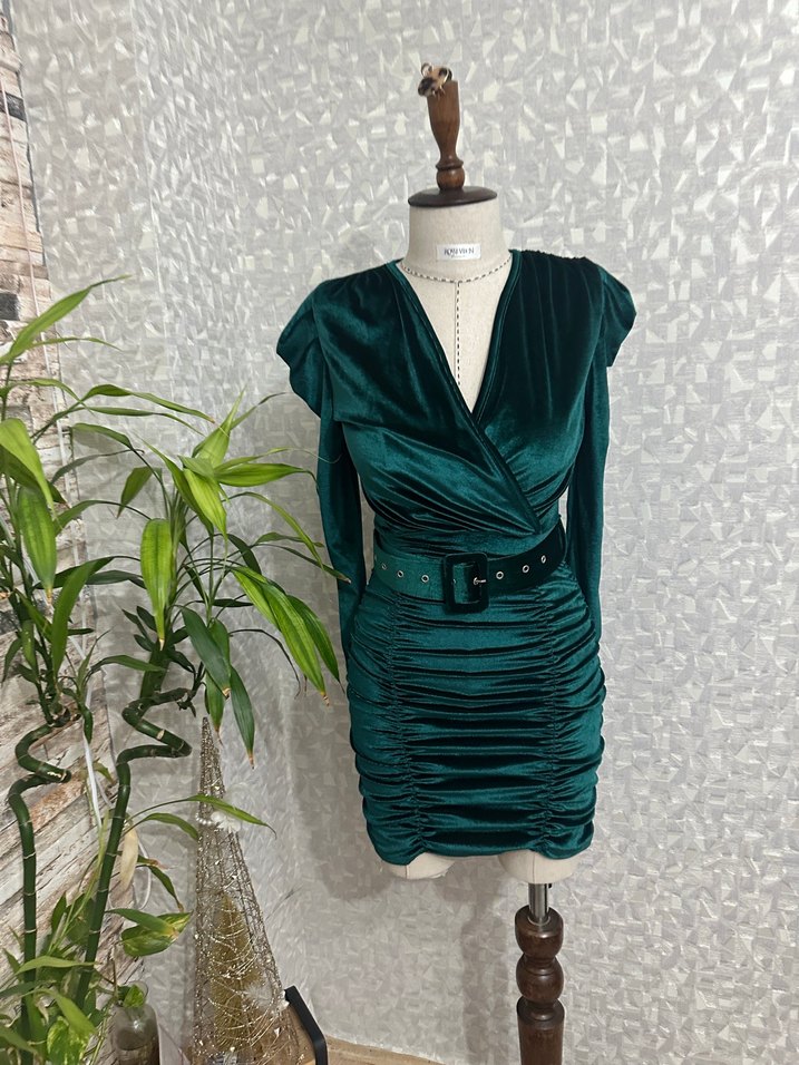 Kemerli, V yakalı ve kısa kesim yeşil elbise, büzgülü detayları ve ince askılarıyla romantik akşamlar için uygundur.