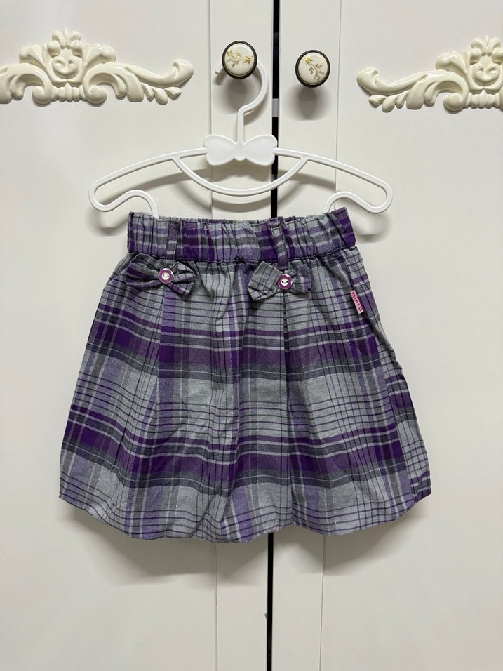 Kemerli bel yapısına sahip, mor ve gri ekose desenli, yumuşak sentetik kumaştan yapılmış bol kesim kız eteği. Trend sokak giyimi için uygundur. 7-8 yaş