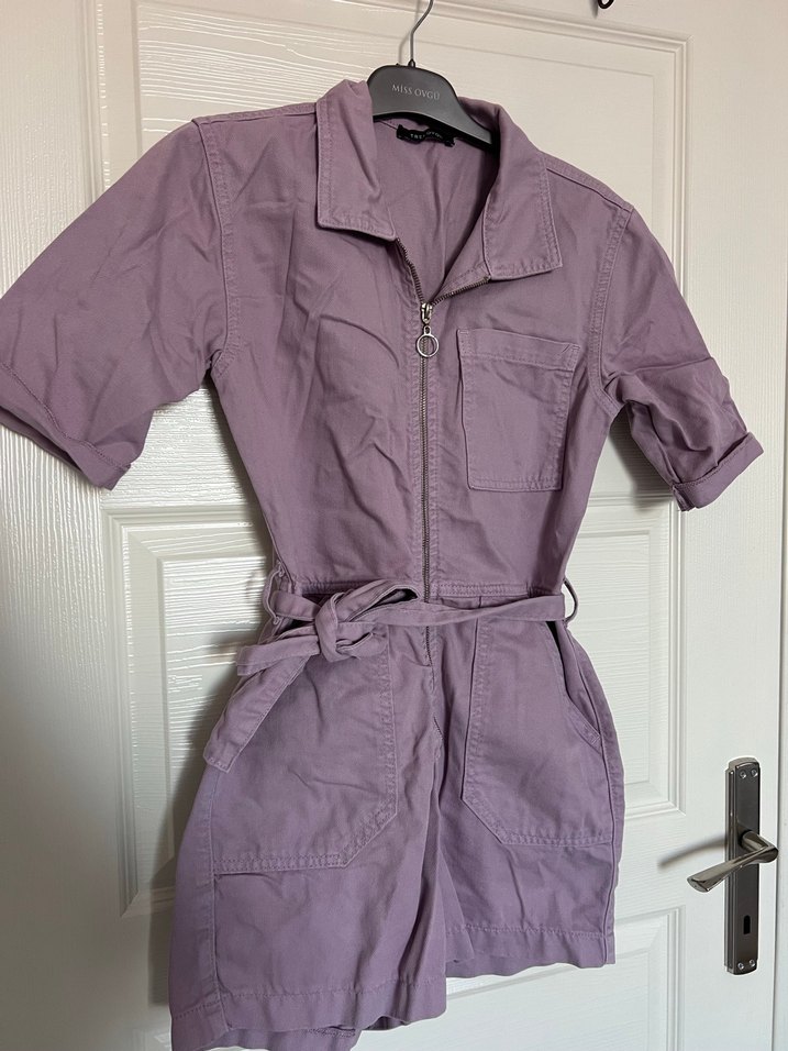 Trendyol Kemerli, kısa kollu ve yaka detaylı mor tulum. Keten kumaştan, günlük rahat sokak stili için uygundur.