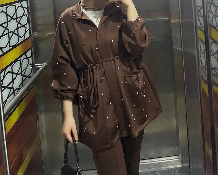 Kemerli Nakışlı Uzun Kahverengi Kadın Ceket Takım