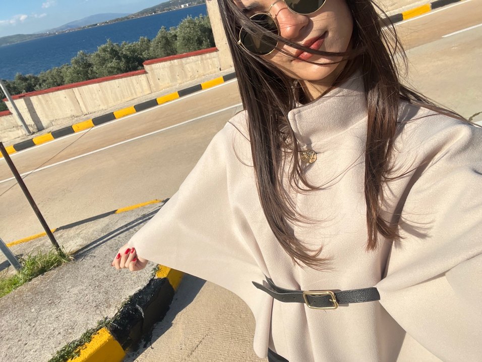 Bej renkli deri mini panço, boğazlı yaka ve uzun kollu, kemerli ve bol kesim, klasik ve şık ofis stili için uygun.