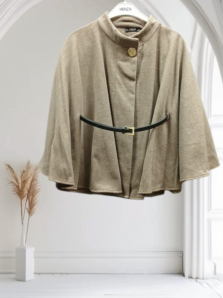 Kemerli bel ve askılı kolları olan bej süet mini panço. Modern klasik tarzda, yakası çıtçıtlı ve salaş kesim. Günlük kullanıma uygun şık bir parça.