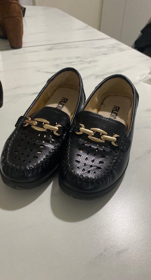 Kemerli, parlak siyah renkte, yılan desenli erkek çocuk loafer ayakkabı. Dayanıklı kauçuk taban kullanılmıştır.