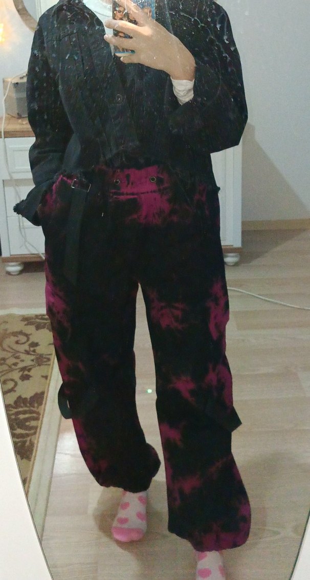 Pembe siyah bağlama desenli, kemerli ve bol kesim kız pantolonu, sentetik kumaştan üretilmiştir. Gotik tarz için uygundur. kadın ve genç kız için uygun