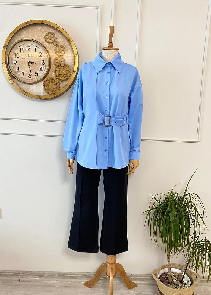 Kemer detaylı Poplin gömlek açık mavi renk 38-40-42-44-46 beden seçenekleriyle
