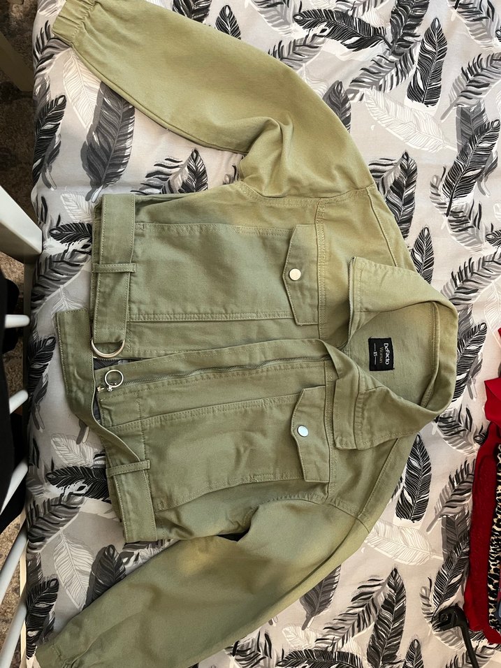 Kemerli ve rahat kesime sahip, yeşil renkte kadın ceketi. Notch yaka ve normal midi uzunluğunda, günlük kullanım için sentetik kumaştan. Sıfıra yakındır. Hiçbir yerinde defosu yoktur.
