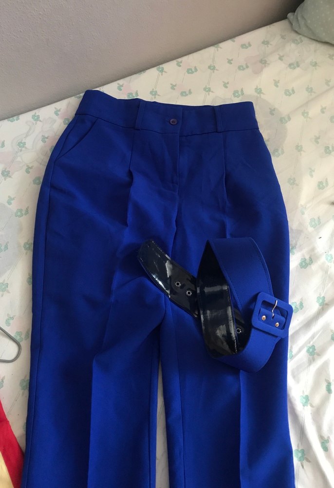 Kemerli, regular fit, midi boy saks mavisi kadın kumaş pantolon. Sokak stili ve iş tarzına uygun.