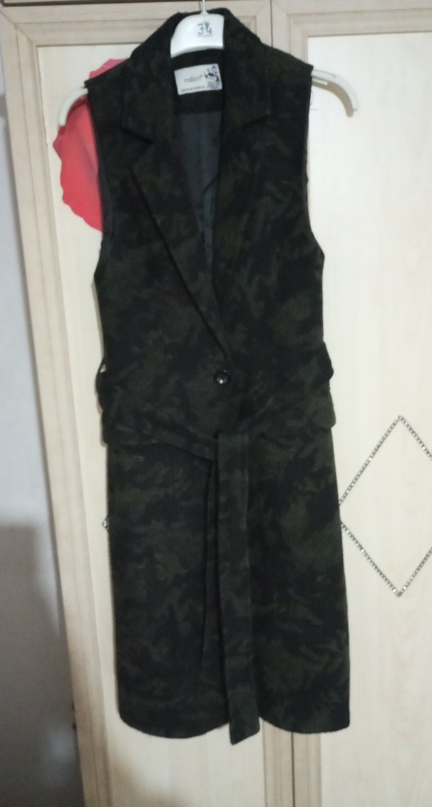 Uzun siyah askerî kamuflaj desenli kadın yelek, kemerli ve notched lapel yakaya sahiptir. yün ve pamuk kumaştan üretilmiş, kolsuz ve regular fit kesimlidir.