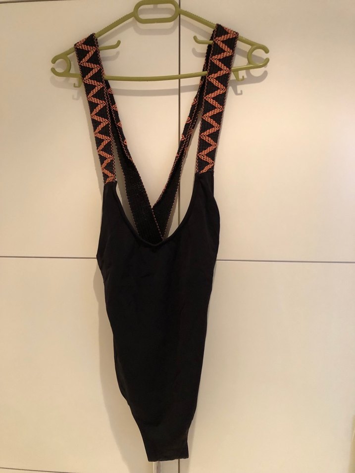 Kemerli ve bağlamalı askılara sahip, siyah bağlamalı desenli, vücuda oturan kadın mayosu. Dış mekan kullanımı için uygundur. ️