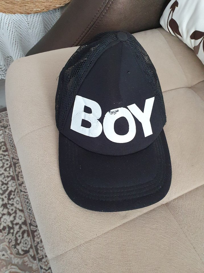 Kemerli, plastikten yapılmış siyah erkek çocuk şapkası, üzerinde 'BOY' baskısı bulunur ve nefes alabilen file arka kısma sahiptir.