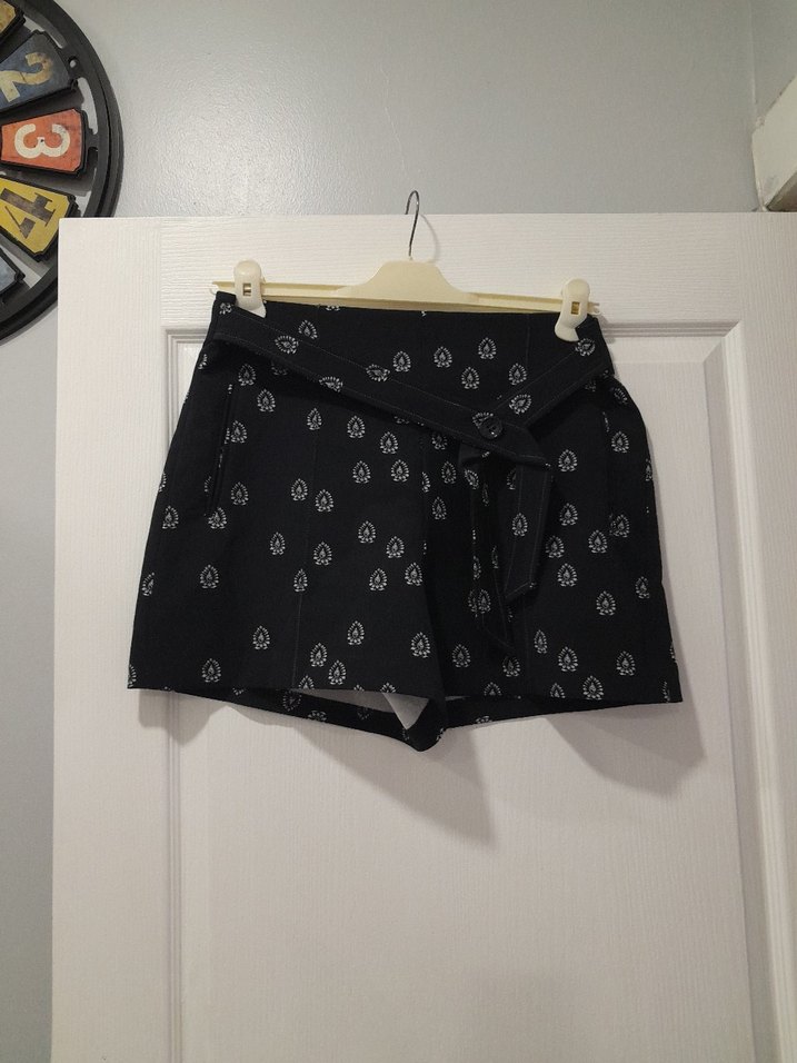 Sentetik kumaştan kemerli, siyah batik desenli, bol kesim mini şort. Günlük rahat kullanıma uygundur.