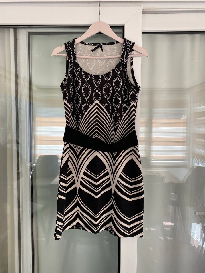 Kemerli, kolsuz siyah beyaz elbise. Geometrik desenli, sentetik kumaştan, günlük kullanıma uygun. Ön kısımda tüylenmeler mevcut.