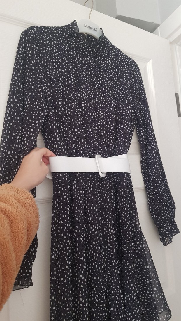 Kemerli, yüksek yakalı, askılı kollu siyah beyaz yılan desenli, sentetik kumaştan yapılmış, vücuda oturan midi elbisedir.