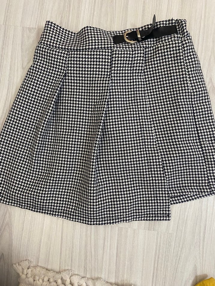 Siyah beyaz kareli desenli, kemerli ve bol kesim mini etek, sentetik kumaştan, günlük sokak stili için uygundur.