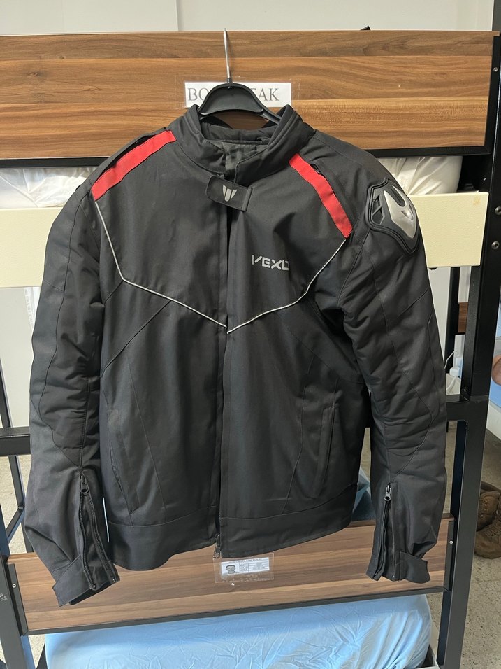 Kemerli, uzun kollu, siyah biker ceket. Notch yaka ve baskılı detaylara sahip. Dayanıklı sentetik kumaştan üretilmiş, sokak stiline uygun. "VEXI" logosu ve kırmızı omuz şeritleri bulunur. Mont güzel ve temiz kullanılmıştır deformesi yırttığı söküğü yoktur 4 mevsim bir monttur içi sökülmelidir