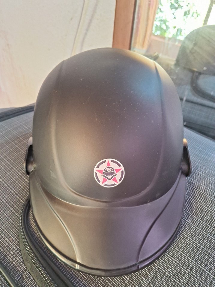 Kemerli kapanışa sahip siyah biker motosiklet kaskı, dayanıklı plastikten yapılmış ve koyu mat renkte baskılı deseni bulunur. ️Ürün m beden.