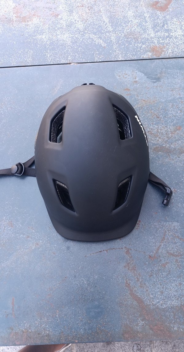 Kemerli kayışa sahip siyah biker motosiklet kaskı, düz kauçuk yüzeyli ve rock punk havasında. ️