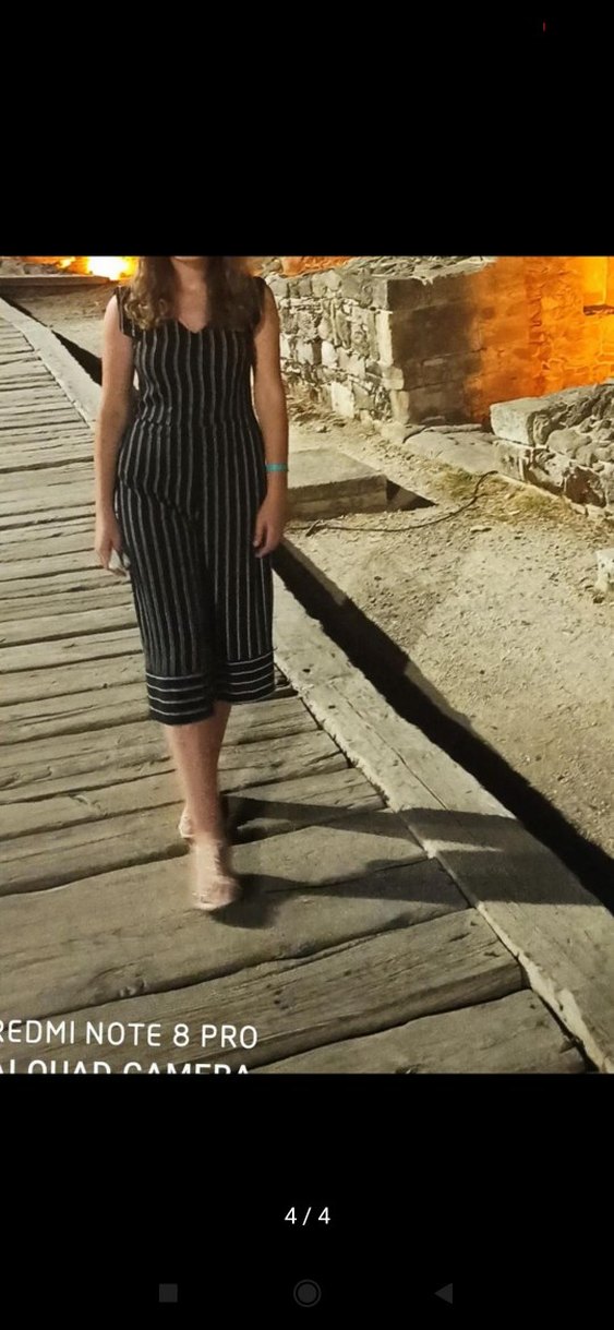 Siyah beyaz çizgili, kemerli ve V yakalı, askılı midi tulum. Günlük kullanıma uygun, rahat sentetik kumaştan yapılmıştır.