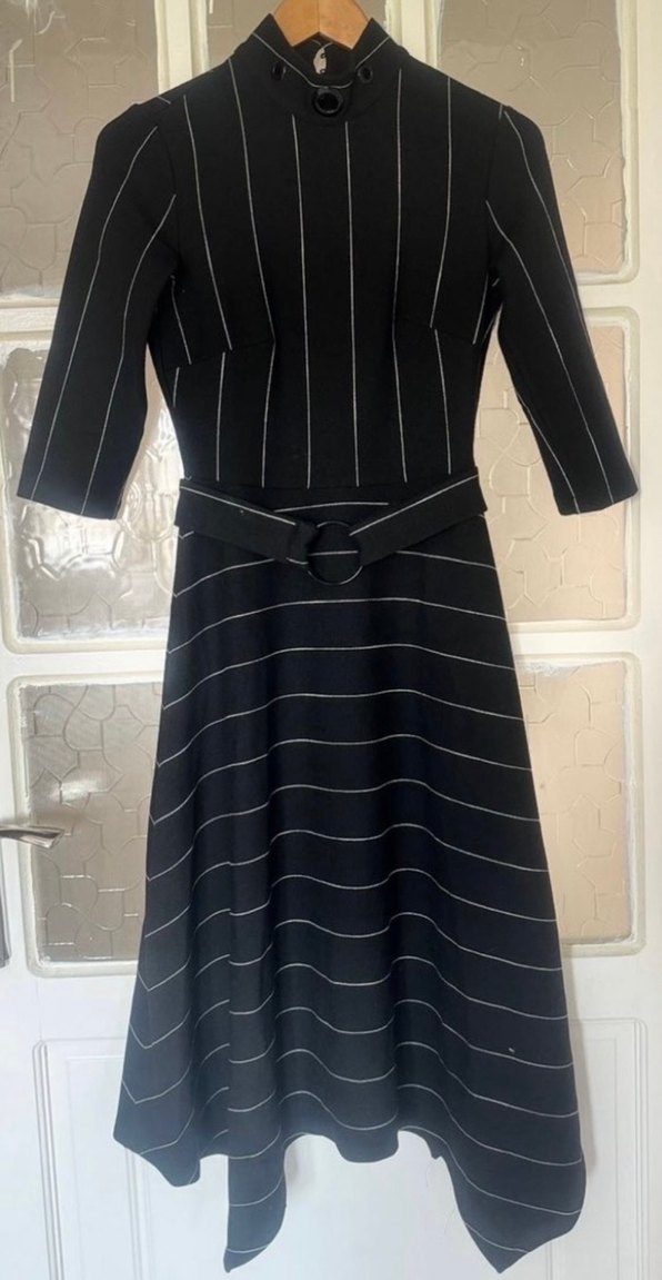 Siyah uzun elbise, çizgili desene, kemerli bele ve üç çeyrek kollara sahiptir. Kayık yaka ve rahat kesim ile klasik şıklık ve gotik stil sunar, ofise uygundur.