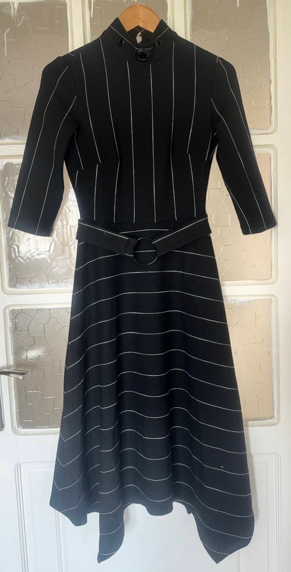 Kemerli siyah uzun elbise, V yaka ve çizgili desene sahiptir. Strappy kollu ve regular fit modeli ile ofis için uygundur. Modern klasik tarzda, sentetik kumaştan.
