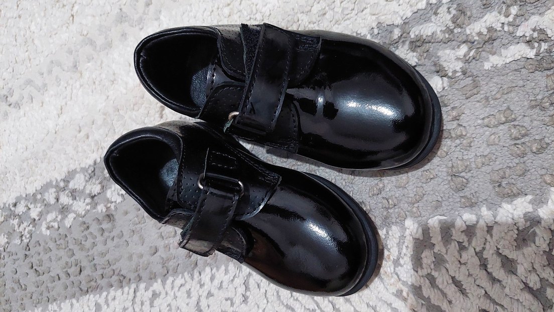 Siyah, kemerli, lastik malzemeden yapılmış, parlak gotik tarzda çocuk özel ayakkabısı. Klasik şıklık için uygun.