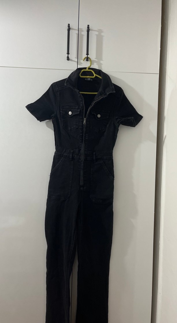 Kısa kollu, kemerli siyah denim tulum. Notlu yaka ve vücuda oturan kesimiyle rahat ve şık bir günlük tercih.