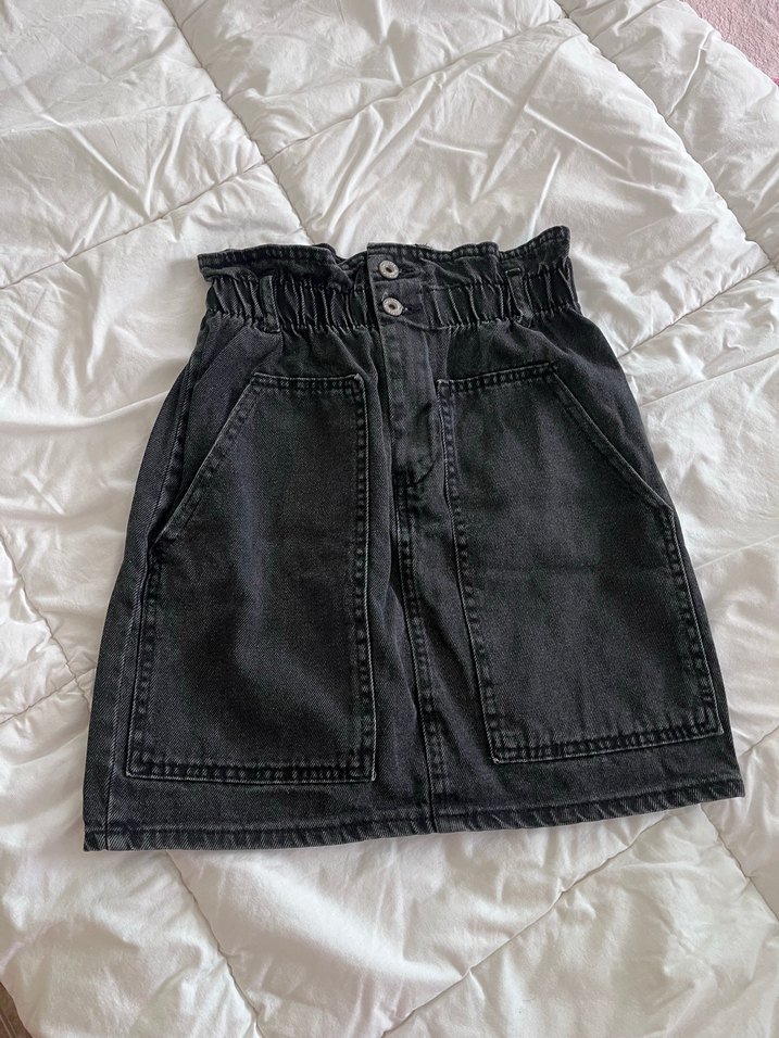Kemer detaylı, büyük ön cepli siyah denim midi etek, rahat sokak stili için uygundur. Deformesizdir.