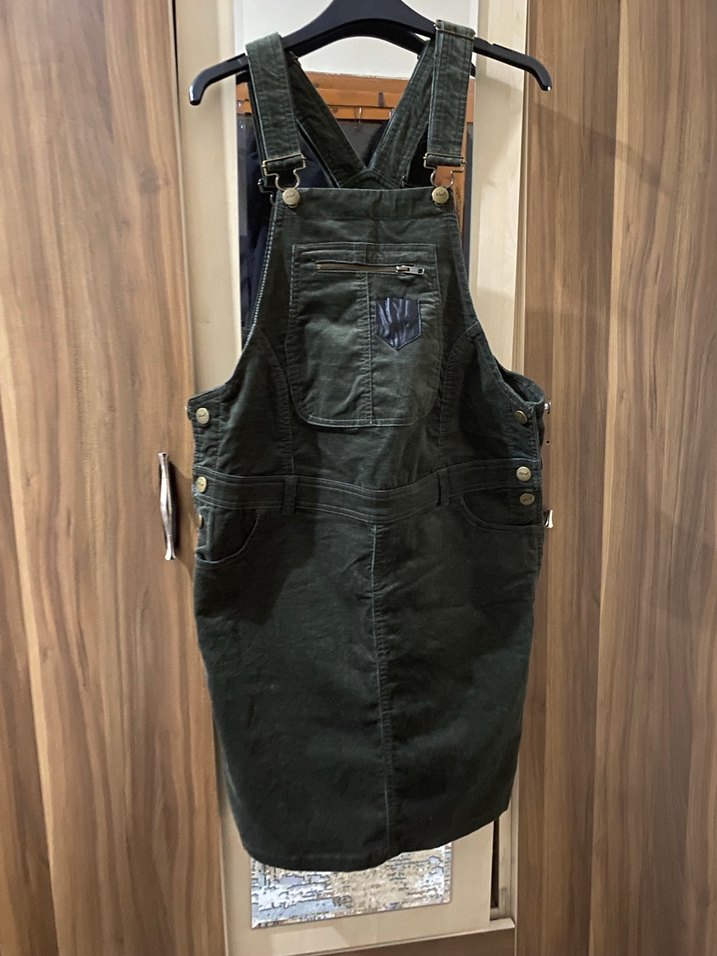 Kemerli, yüksek yakalı, kolsuz ve fitted kesime sahip siyah denim midi salopet, günlük sokak modası için uygun.