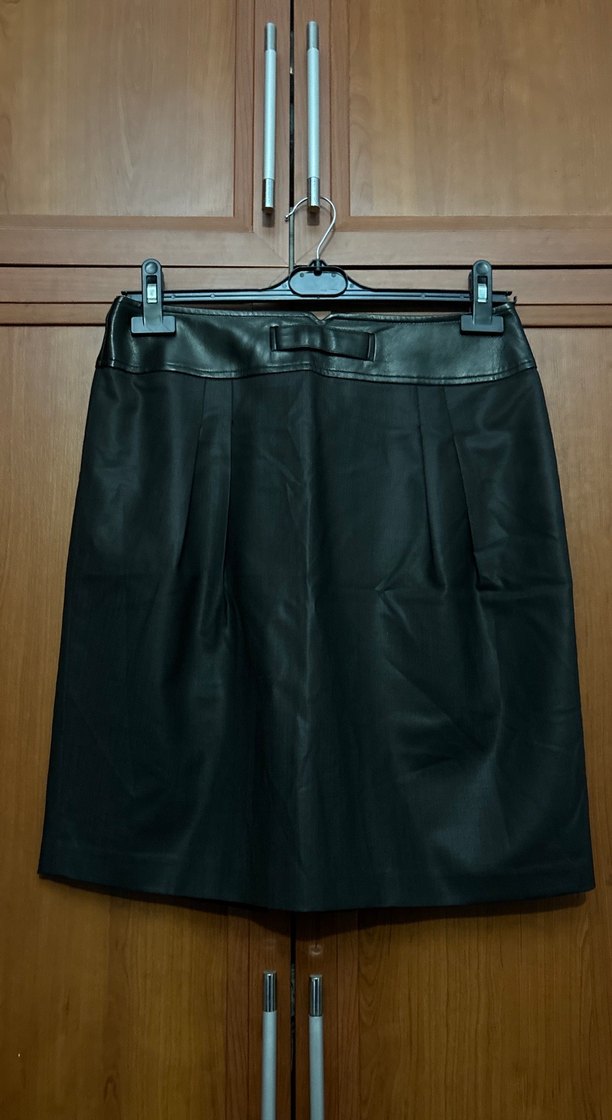 Kemerli siyah deri midi etek, dar kesim ve desensiz tasarımıyla ofis için uygun gotik tarzda şık bir parça.