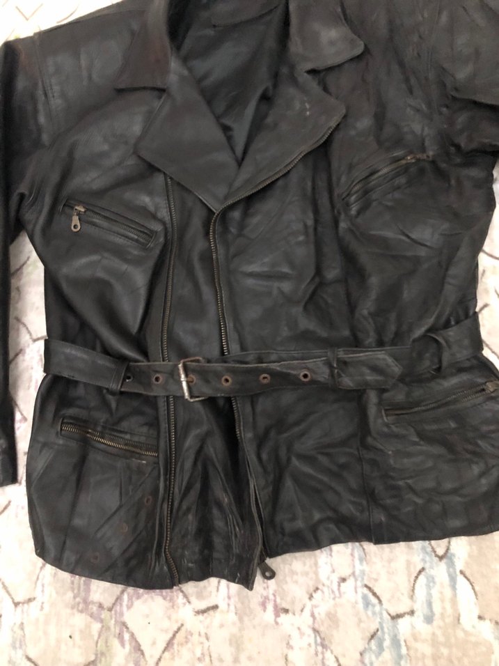 Kemerli bel ve kesimli yakaya sahip siyah deri biker ceket. İnce kesim, askılı kollar ve midi boy uzunluk içerir. 1990’lı yıllardan kalma olup, üzerinde yılların yorgunluğu vardır.