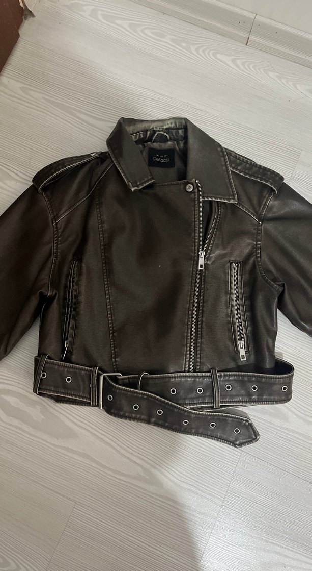 eskitmeli model herhangi bir kusuru yok yeni gibi Kemerli bel, strappy kollu ve yaka detaylı siyah deri biker ceket, rock punk tarzını yansıtır. Fitted kesim ve midi boydadır.