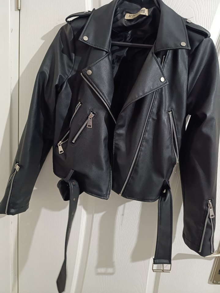 Siyah deri, kemerli, fitted biker ceket. Notch yaka ve bantlı kollara sahip, gotik rock punk havası verir. Günlük kullanıma uygun.