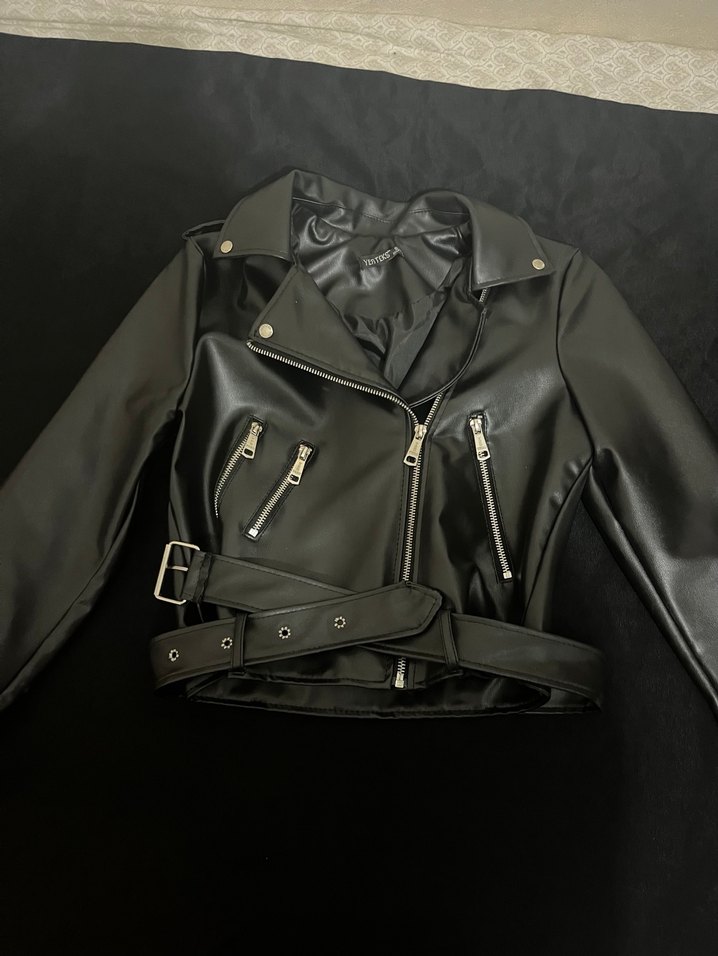 Kemerli siyah deri biker ceket, oturan kesim, kesik yakalı ve askılı kollu. Fermuarlı cepler ve kemer detayıyla grunge punk tarzını yansıtır. Kısa ve desensiz, günlük kullanıma uygun. .