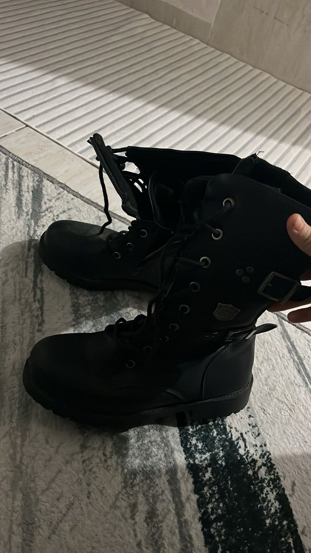 Kemer detaylı, blok topuklu siyah deri gotik botlar, günlük kullanıma uygun rock punk havasında.