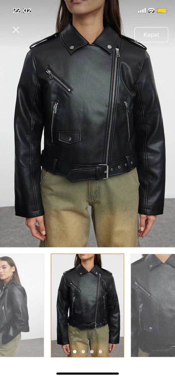 Kemerli, siyah deri biker ceket. Normal boy, keskin yaka ve kayışlı kollara sahip, günlük rahat stil için uygundur.