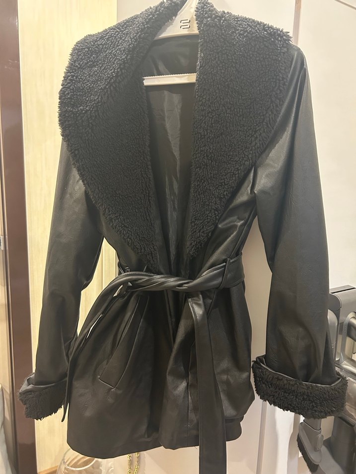 Bu kemerli siyah deri ceket, geniş ve yumuşak dokulu yakası ve manşetleri ile dikkat çeker. Notlu yaka ve midi boy kesime sahiptir.