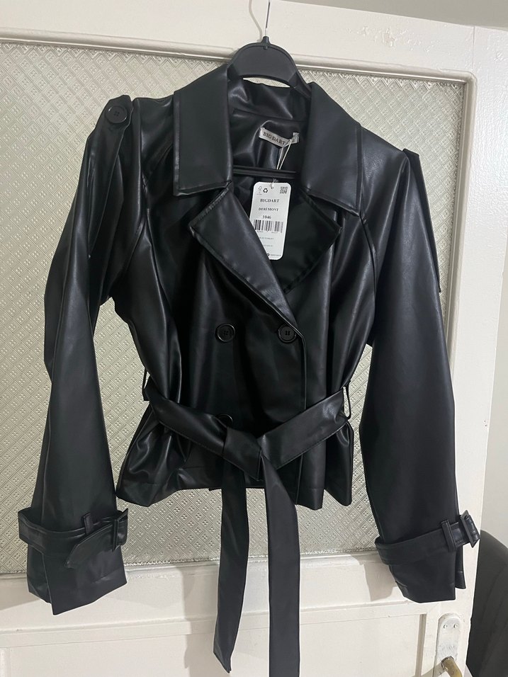 Kadın deri ceketi, kemerli bel ve kesik yakaya sahip. Kısa uzunlukta, kayış detaylı kollu, günlük kullanıma uygun siyah renkte.
