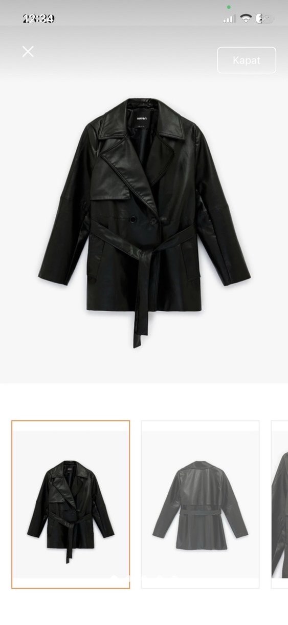 Kemerli siyah deri ceket, keskin yaka ve askılı kollara sahip. Kısa ve normal kesim, minimalist sokak stiliyle ofis kullanımı için uygun.